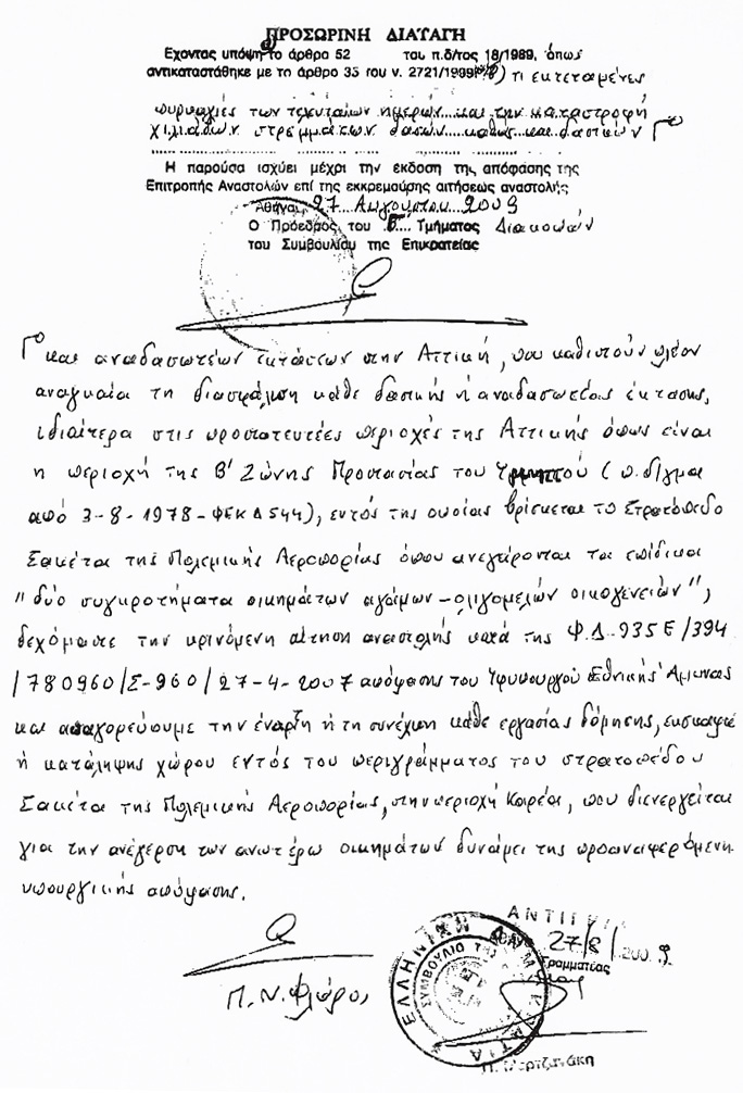 Θετική έκβαση είχαν τόσο οι αλλεπάλληλες παραστάσεις και πρωτοβουλίες των 15 Δημάρχων του Συνδέσμου Προστασίας και Ανάπτυξης του Υμηττού (ΣΠΑΥ) και του Προέδρου του και Δημάρχου Βύρωνα Νίκου Χαρδαλιά, όσο και όλων των παρατάξεων του και ενεργών πολιτών του Δήμου μας, καθώς ο Αντιπρόεδρος του ΣτΕ και Πρόεδρος του Γ? Τμήματος Διακοπών του Συμβουλίου κ. Π. Φλώρος, με βάση τα νέα στοιχεία που προσκόμισαν οι νομικοί σύμβουλοι του Δήμου Βύρωνα, προχώρησε στην έκδοση προσωρινής διαταγής απαγόρευσης των οικοδομικών εργασιών εντός του πρώην στρατοπέδου της 350 Π.Μ. στον Υμηττό.
