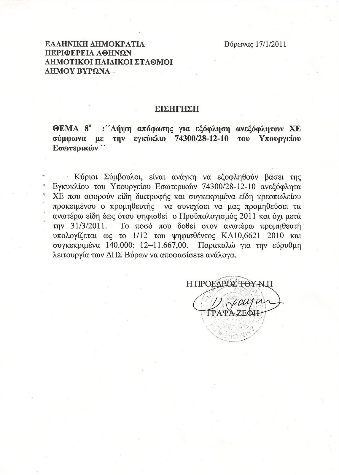 Για την επιβεβαίωση και για να κρίνουν οι ίδιοι οι πολίτες του Βύρωνα για το ποιος λέει αλήθεια ή ψέματα σας δημοσιοποιούμε την εισήγηση που μάς δόθηκε από το Νομικό Πρόσωπο των Παιδικών Σταθμών σύμφωνα με την οποία στη συνεδρίαση στις 17/01/2011 καλείται το Διοικητικό Συμβούλιο να λύσει στο πρόβλημα που έχει προκύψει.