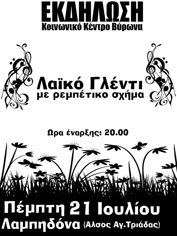 Την Πέμπτη 19/07 στις 20:00 το Κοινωνικό Κέντρο Βύρωνα διοργανώνει λαϊκό γλέντι, με ρεμπέτικο σχήμα, στο χώρο της Λαμπηδόνας.