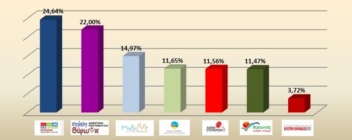 Σύμφωνα με το Υπουργείο Εσωτερικών, τα αποτελέσματα του πρώτου γύρου των Δημοτικών Εκλογών στο δήμο Βύρωνα, έχουν ως εξής:
