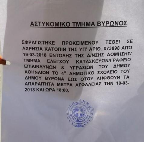 Σφραγίστηκε το απόγευμα της Δευτέρας το 4ο Δημοτικό Σχολείο Βύρωνα μετά από αυτοψία που προηγήθηκε από τη Διεύθυνση Δόμησης, Τμήμα Ελέγχου Κατασκευών Δήμου Αθηναίων και κρίθηκε «επικίνδυνο από άποψη στατική, δομική και δημόσιας ασφάλειας και γι’ αυτό το λόγο απαιτείται η αχρησία του συνόλου του σχολείου έως ότου ληφθούν τα απαραίτητα μέτρα ασφάλειας».