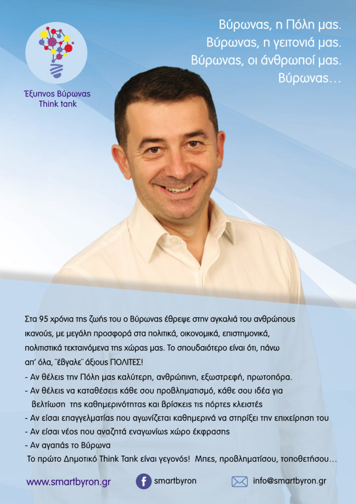 Λίγες μόνο ημέρες μετά την ανεξαρτητοποίησή του, ανακοινώθηκε η ίδρυση δημοτικού think tank, υπό την ονομασία «Έξυπνος Βύρωνας», ανάμεσα στα μέλη του οποίου βρίσκεται και ο κ. Μουντοκαλάκης.