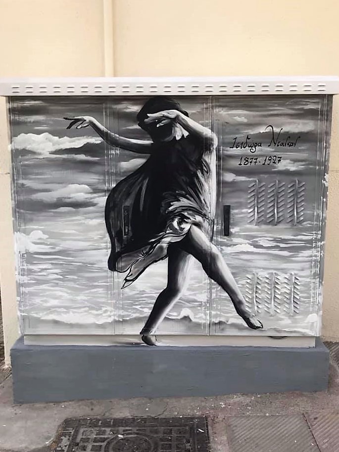 Ένα από τα πιο όμορφα ζωγραφισμένα ΚΑΦΑΟ στον Βύρωνα, που είχε φιλοτεχνήσει η ομάδα SpyLex Design, ήταν εκείνο στην οδό Αδραμυτίου που απεικόνιζε την Ισιδώρα Ντάνκαν. Όμως, δυστυχώς, κάποιοι αποφάσισαν να το βανδαλίσουν με συνθήματα.