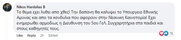 Όπως αναφέρει ο κ. Χαρδαλιάς έχει ενημερωθεί αρμοδίως η Διεύθυνση του 5ου Λυκείου Βύρωνα.